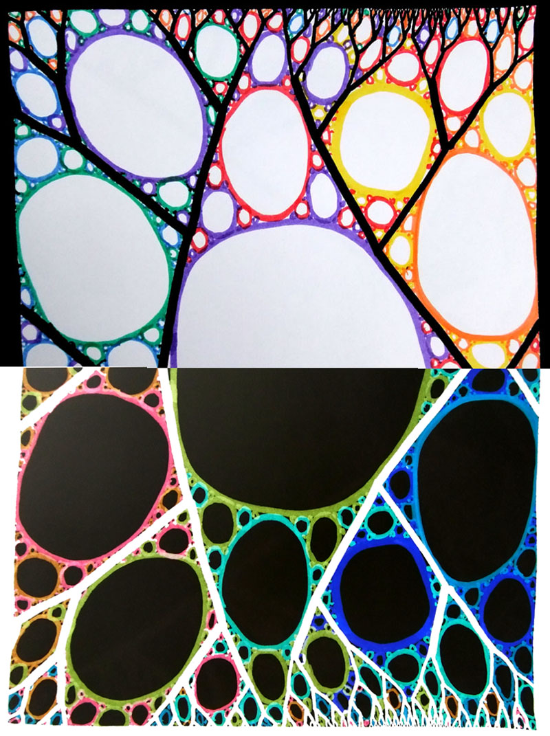 This one started as a hand-doodled binary tree, but it quickly bloomed Appolonian gaskets between the branches.