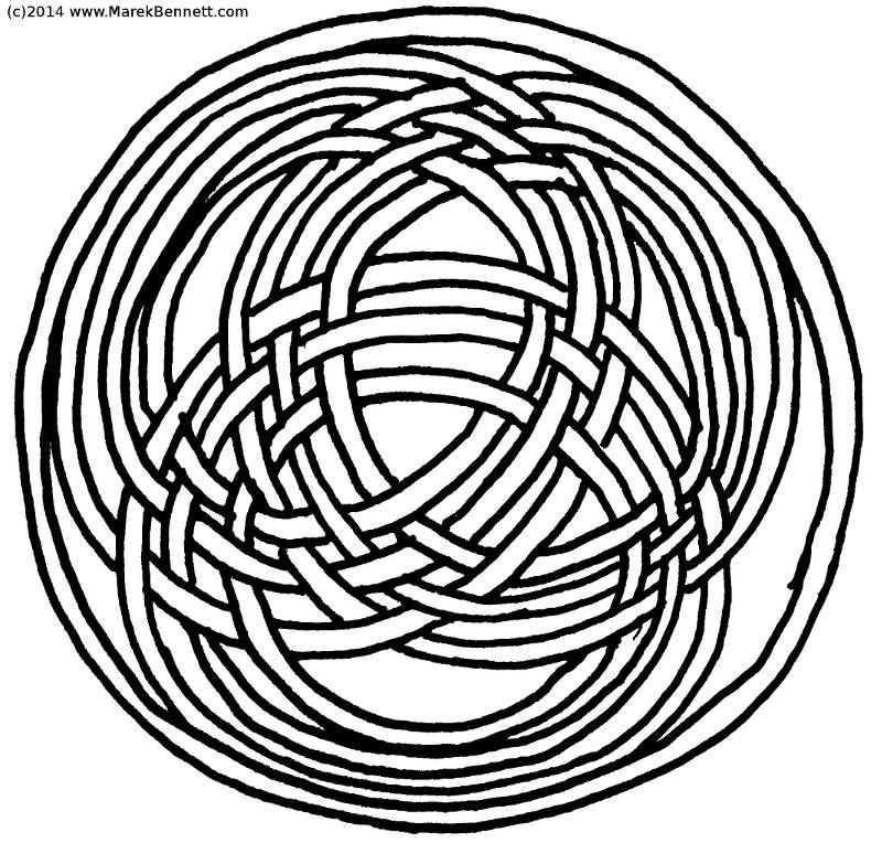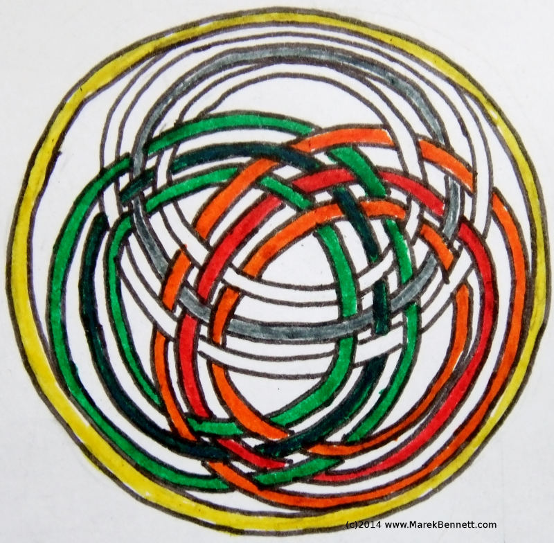 They look like they’re tightly knotted, but if you look closely you’ll see that no two rings are linked with each other. Maybe it’s obvious why this is…  For starters, the OVER-UNDER-OVER-UNDER pattern we use to draw them seems to suggest a sort of EVEN-ODD-EVEN-ODD pattern; and since each ring encounters first ONE other ring and then THE OTHER other ring and then back to the ONE other ring, it’s always either OVER or UNDER any other single ring, but never both.