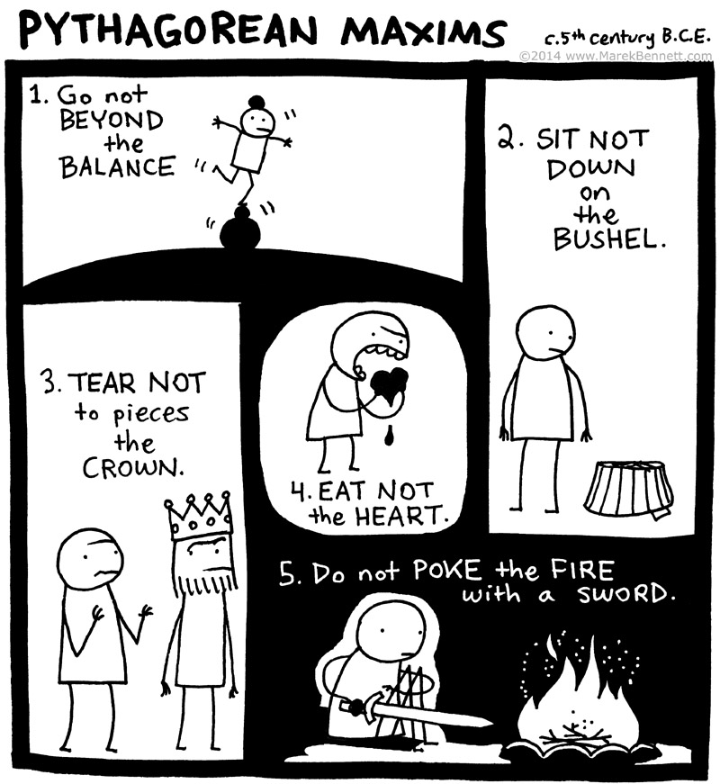 Okay, so maybe this isn’t strictly mathematical per se… But the Pythagorean maxims (or symbols) form a sort of “Rules of the Good Life” according to one of Ancient Greece’s most amazing (and interesting) mathematicians: