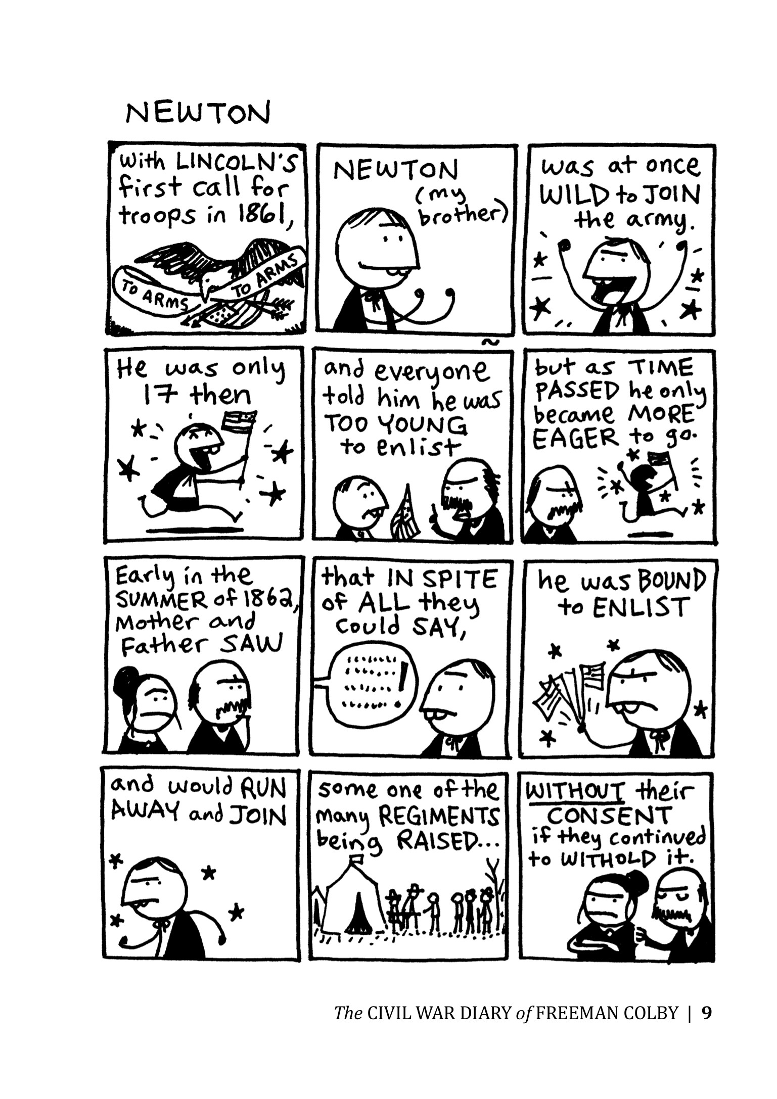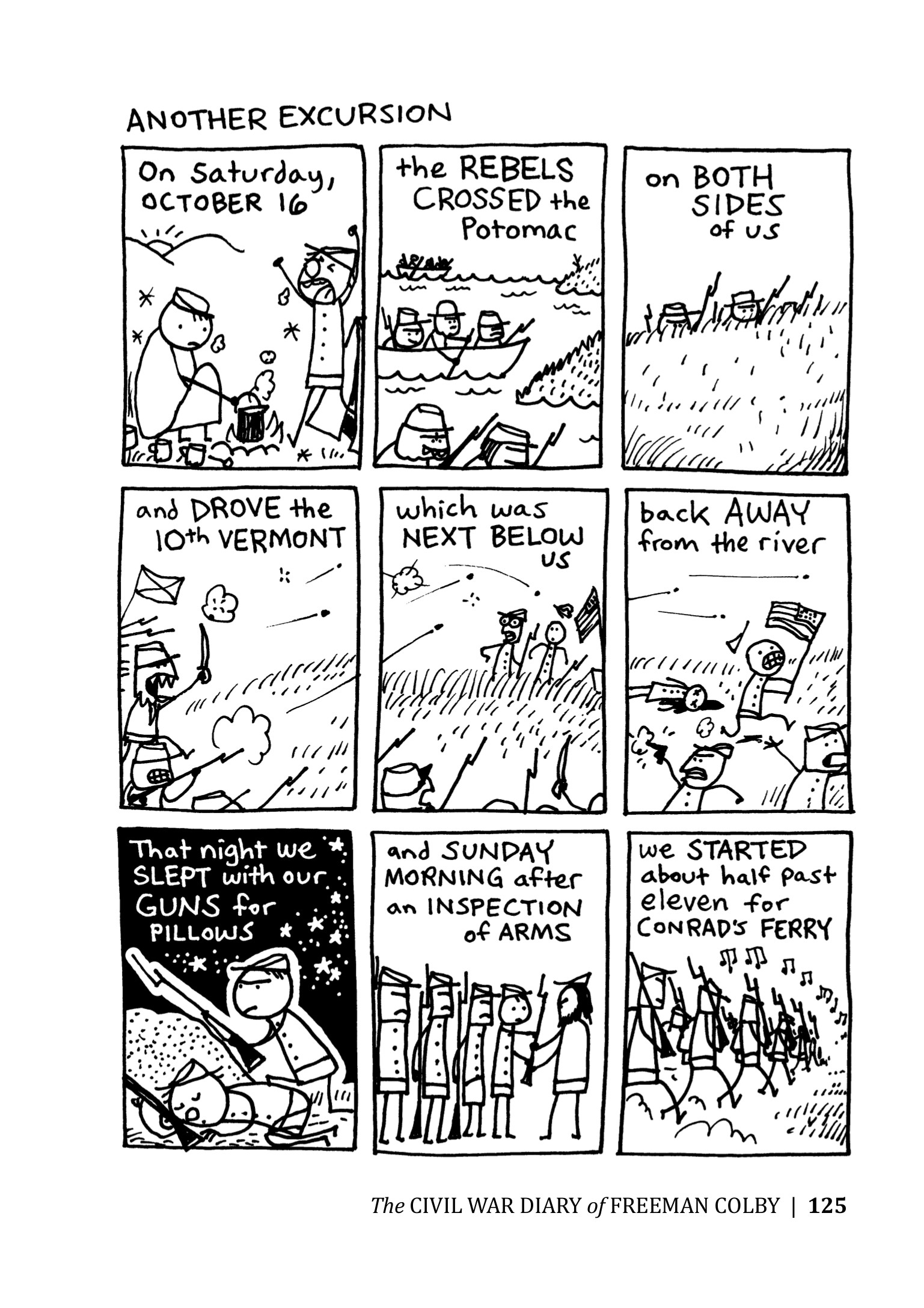 1. Paul ~ I appreciate your kind words, and your description of your reading experience. As an artist, I too had to “get past” some of the stigma around stick figures… but once I did, it became clear that this kind of “extreme cartooning” is really handy for historical work. Since the historical record often lacks ALL the details I need to draw a scene, I believe it’s more accurate to restrict visual details to the bare minimum that can be verified by primary sources. (For example — I’m reasonably sure Freeman Colby had four buttons on his regulation union wool shell coat, so I draw four dots on his torso. I don’t know what kind of footwear he wore (aside from his mention of big “boots”) so for the most part I don’t even draw him with shoes, but just stick feet.) If you are inspired to share your thoughts as a review at GoodReads, here is the link to FREEMAN COLBY’s listing: https://www.goodreads.com/book/show/29958036-the-civil-war-diary-of-freeman-colby … Thanks! ~ M