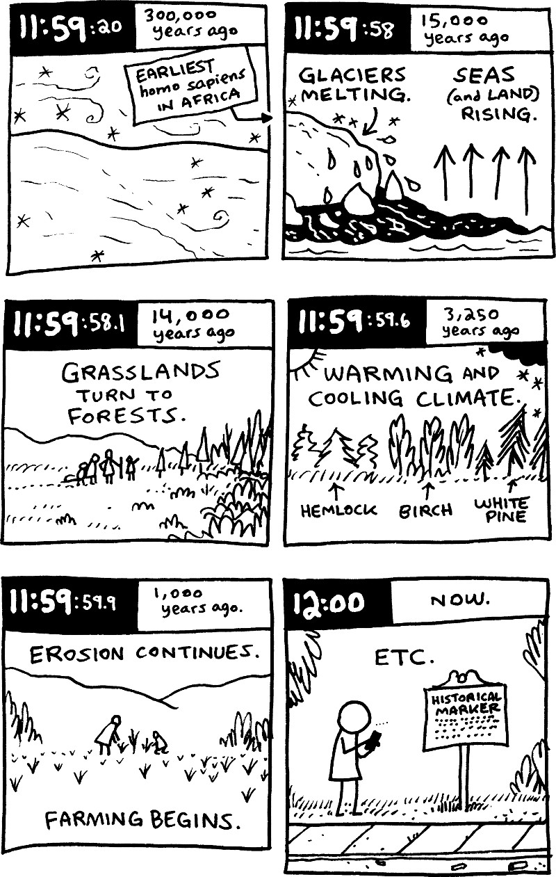 In terms of time periods covered, this is probably the most wide-ranging 8-page mini I’ve ever drawn! I had to leave out a TON of names and details to fit the story into 8 pages. For much, much more information about any of the above panels, please refer to pages 15-45 of Caduto’s book.