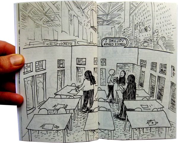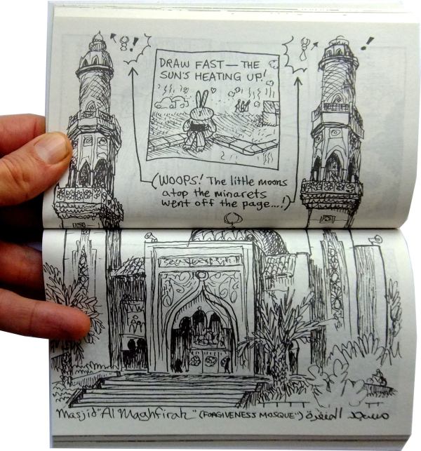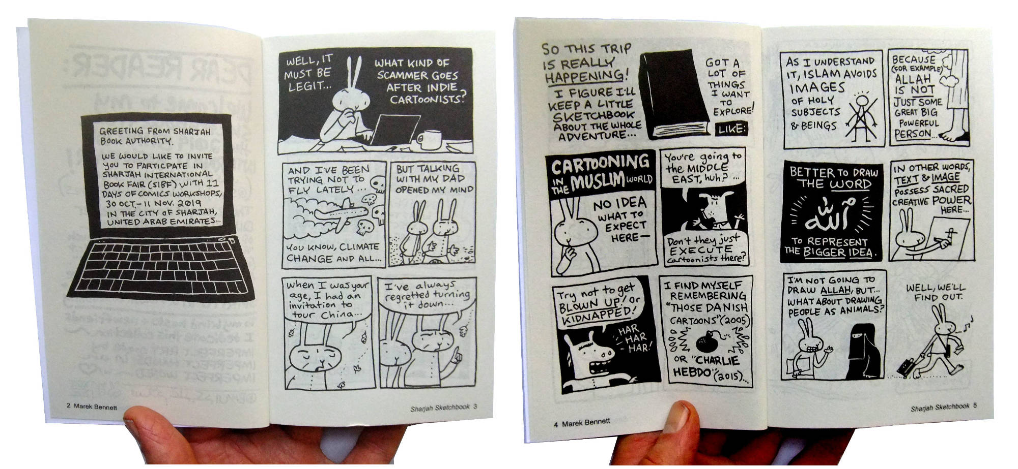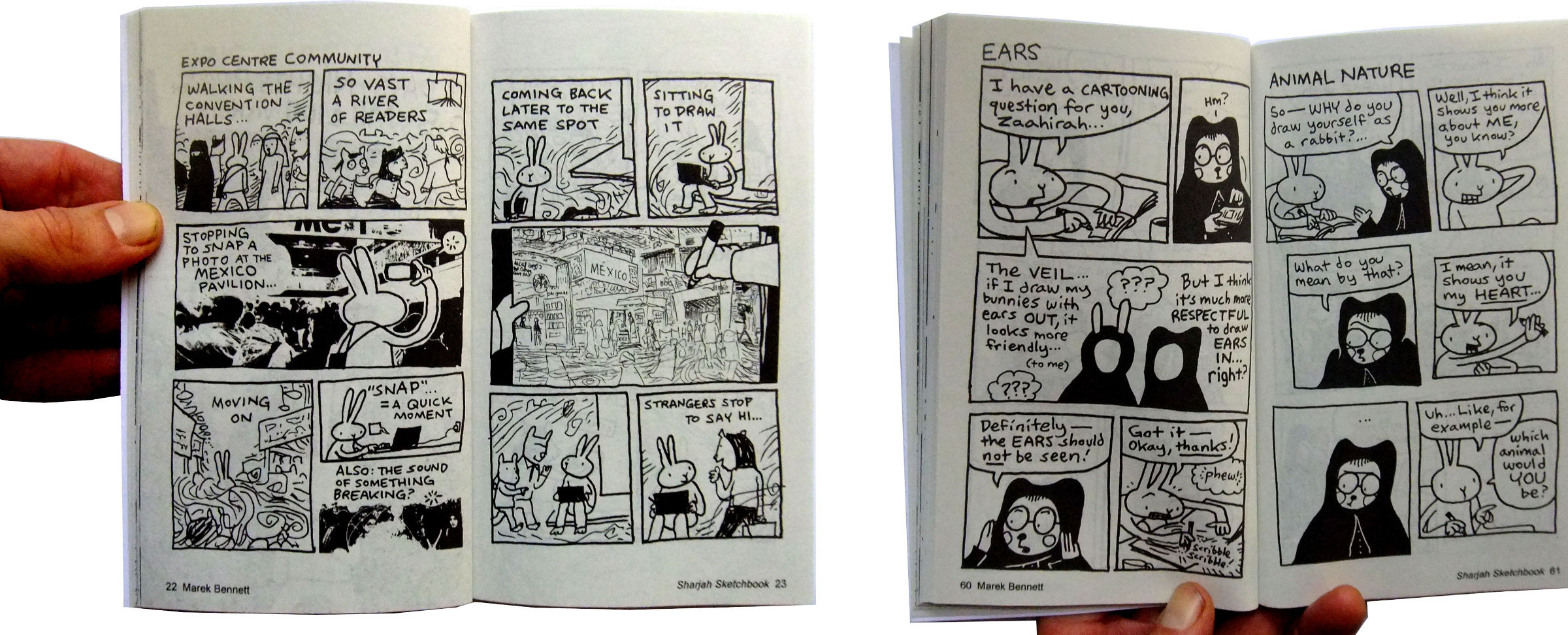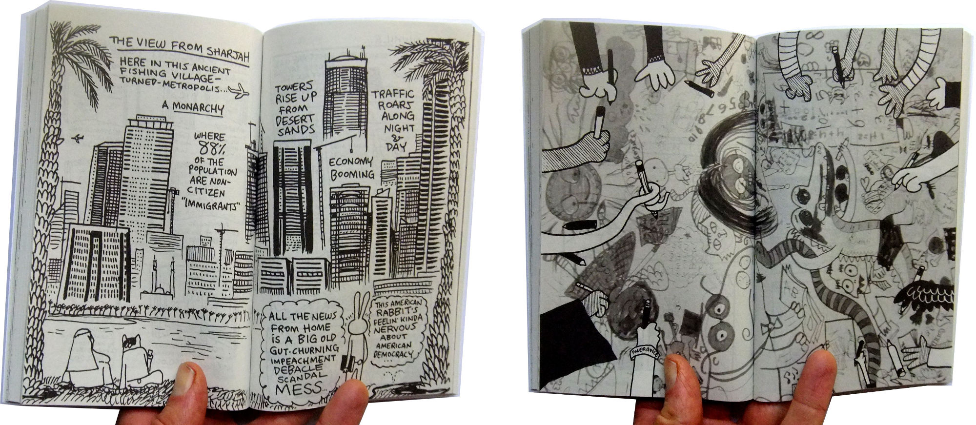 Rabbit’s on the road again, drawing stories & inspiration from the diverse crowds thronging the largest book fair in the Arab world! Created during a teaching trip to Sharjah (United Arab Emirates), these loose, lively diary comics explore themes of migration & travel, language, education, religion, and the role of images & storytelling in a global community.