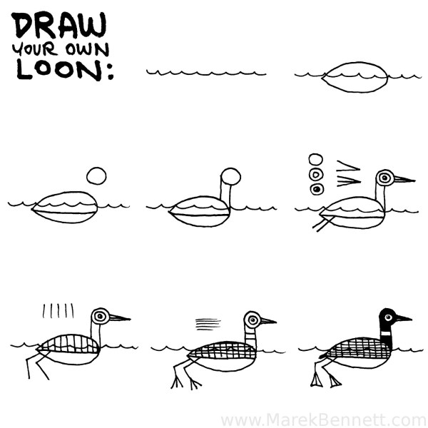 LOONTOONS are my cartoon drawings of common loons. You can print out the PDF mini-comic (above) & fold it into a booklet… Or, grab a pen & paper, & draw along with the video tutorials below!