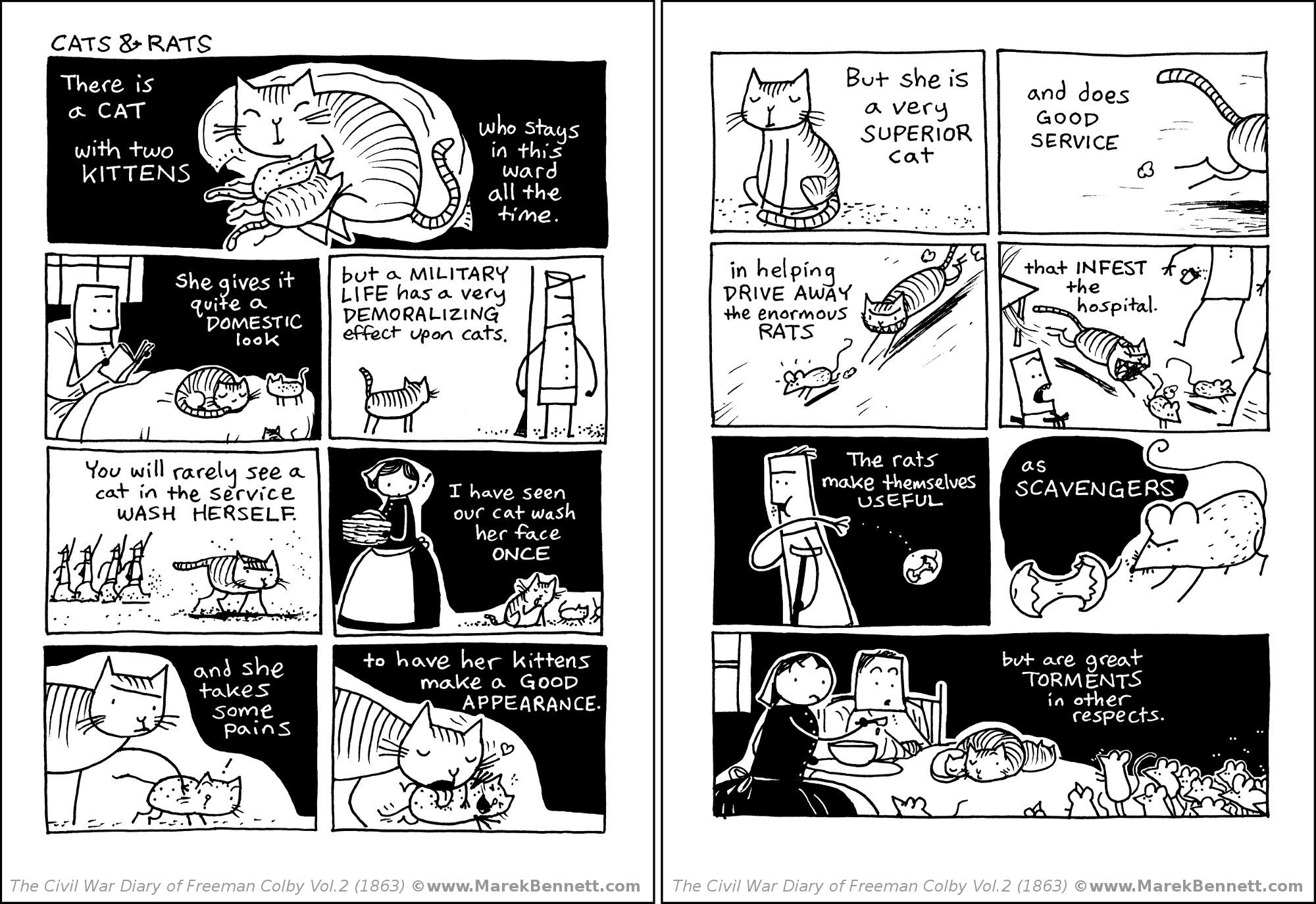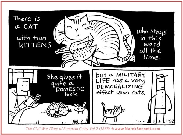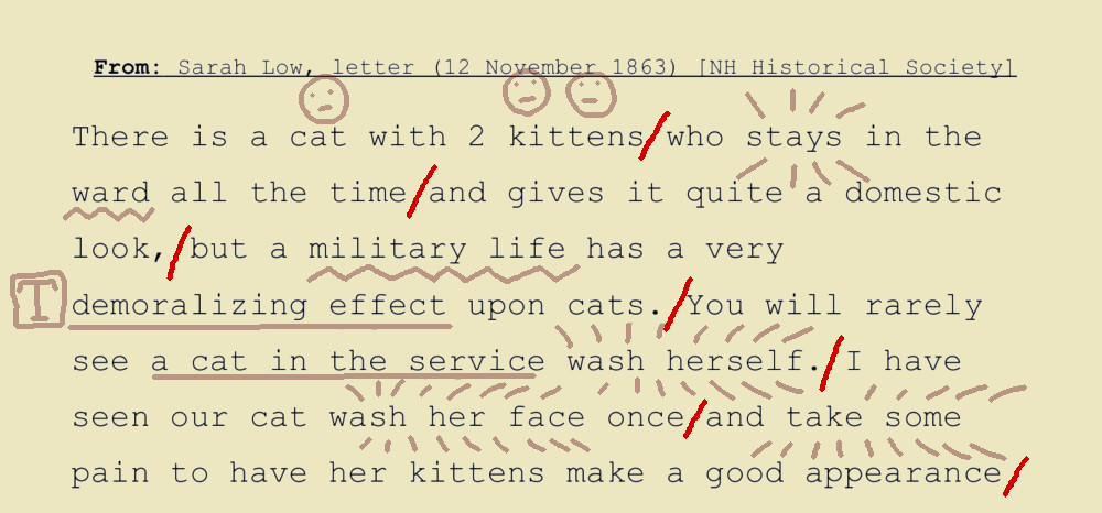 In this sample process, we’re drawing comics from a marked-up section of a letter by Nurse Sarah Low (written from a Washington, D.C. army hospital, 12 November 1863):
