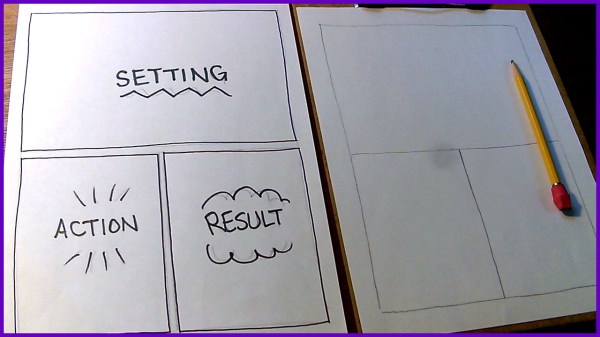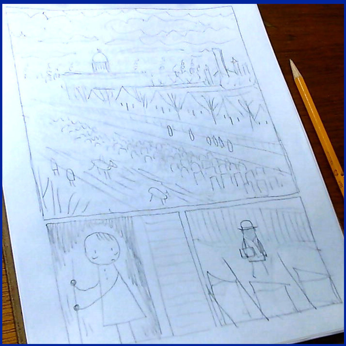 As I draw below, this plan will change a bit — My ACTION and RESULT panels will become CHARACTER panels, showing eyewitnesses reacting to the SETTING panel.