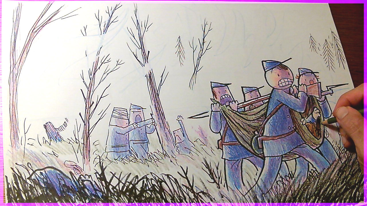 In this poster, Freeman Colby, Jonas Bacon, & the gang are rescuing wounded Union soldiers from the burning woods @ the Battle of the Wilderness!
