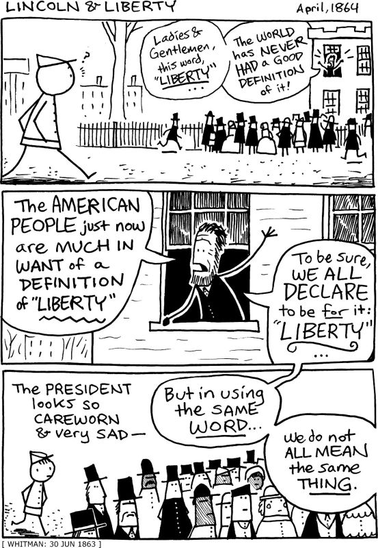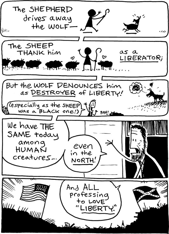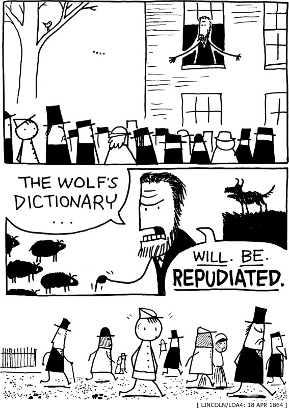 (Colby’s observation in Panel 3 actually comes from a letter by Walt Whitman, who often scrutinized Lincoln in the streets of DC.)