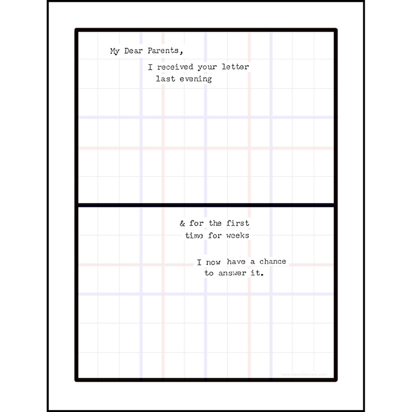 I’ll just read over these blank panels & let my imagination wander through the space. (For example, at “I now have a chance to answer it” I see maybe Freeman Colby seated by a campfire, writing on a tiny bit of paper spread across his dirty knee…)