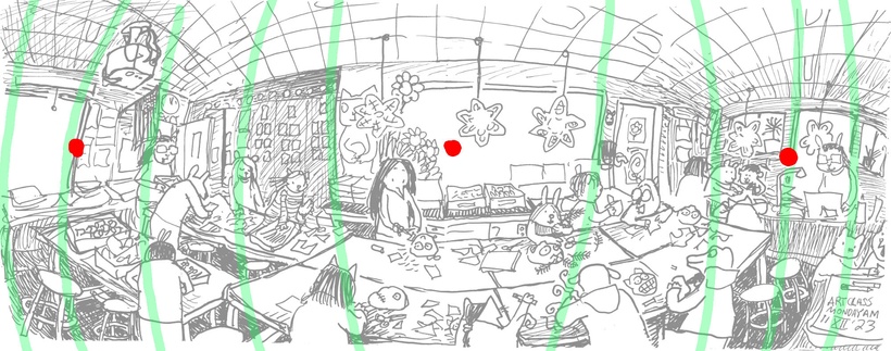 Here’s a panoramic sketch of a bustling classroom — Plus my guidelines for seeing (& tracing) the 3D space: