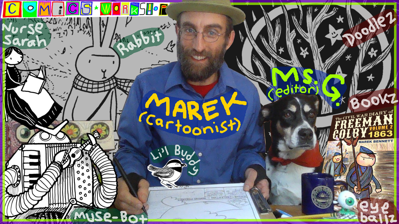 NH-based cartoonist, musician, and educator Marek Bennett leads discovery-based Comics Workshops for all ages throughout New England and the world beyond! His comics work includes the graphic novel series, The Civil War Diary of Freeman Colby, as well as drawing, translating, & editing for The Most Costly Journey (2021) with the bilingual El Viaje Project. In September 2022, both books were featured at the National Book Festival in Washington DC.