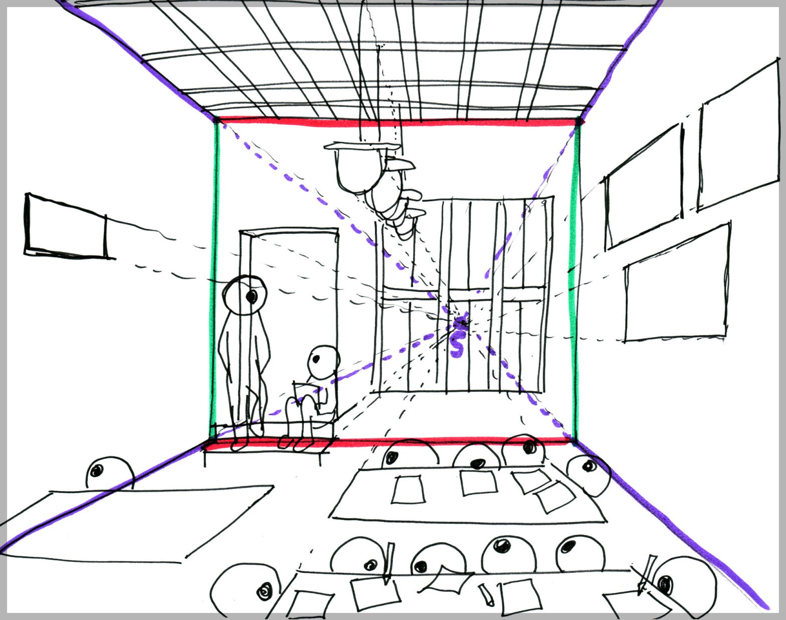 Panoramic sketch of a bustling classroom, w/ guidelines for seeing (& tracing) the 3D space…