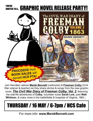 Come learn the basics of comics creation from indie graphic novelist Marek Bennett! Marek will share his tips & techniques of cartooning, visual storytelling, page composition, and how to build shorter episodic “mini-comics” into full-length graphic novels. He’ll also bring along his current project, The Civil War Diary of Freeman Colby, a series of graphic novels drawn entirely from 19th century diaries, letters, journals, and images.