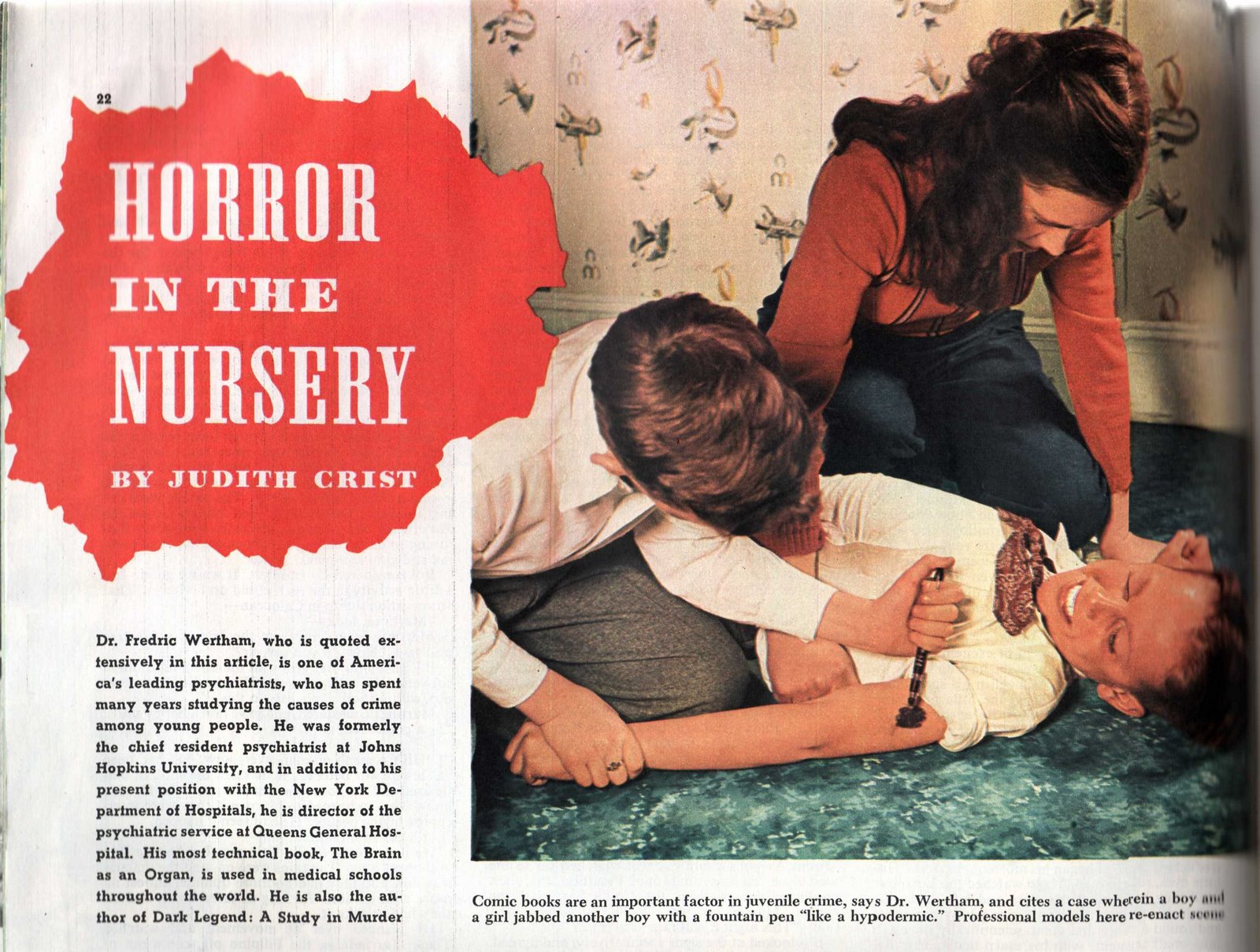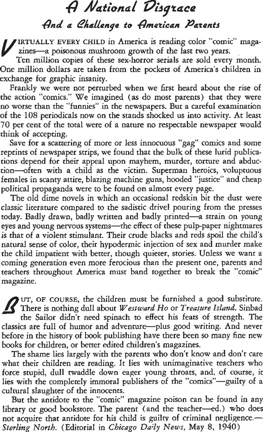 “Virtually every child in America is reading color “comic” magazines — a poisonous mushroom growth of the last two years. Ten million copies of these sex-horror serials are sold every month. One million dollars are taken from the pockets of America’s children in exchange for graphic insanity…”