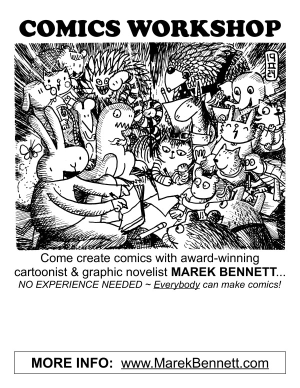 Come create comics with award-winning cartoonist Marek Bennett! Using only blank paper, pencils, ink, & four basic “building blocks” of stories, we’ll craft cool characters in rich settings, & bring them to life in exciting “mini-comics” books that you can self-publish & share with friends & new readers. No experience needed; EVERYBODY can make comics!