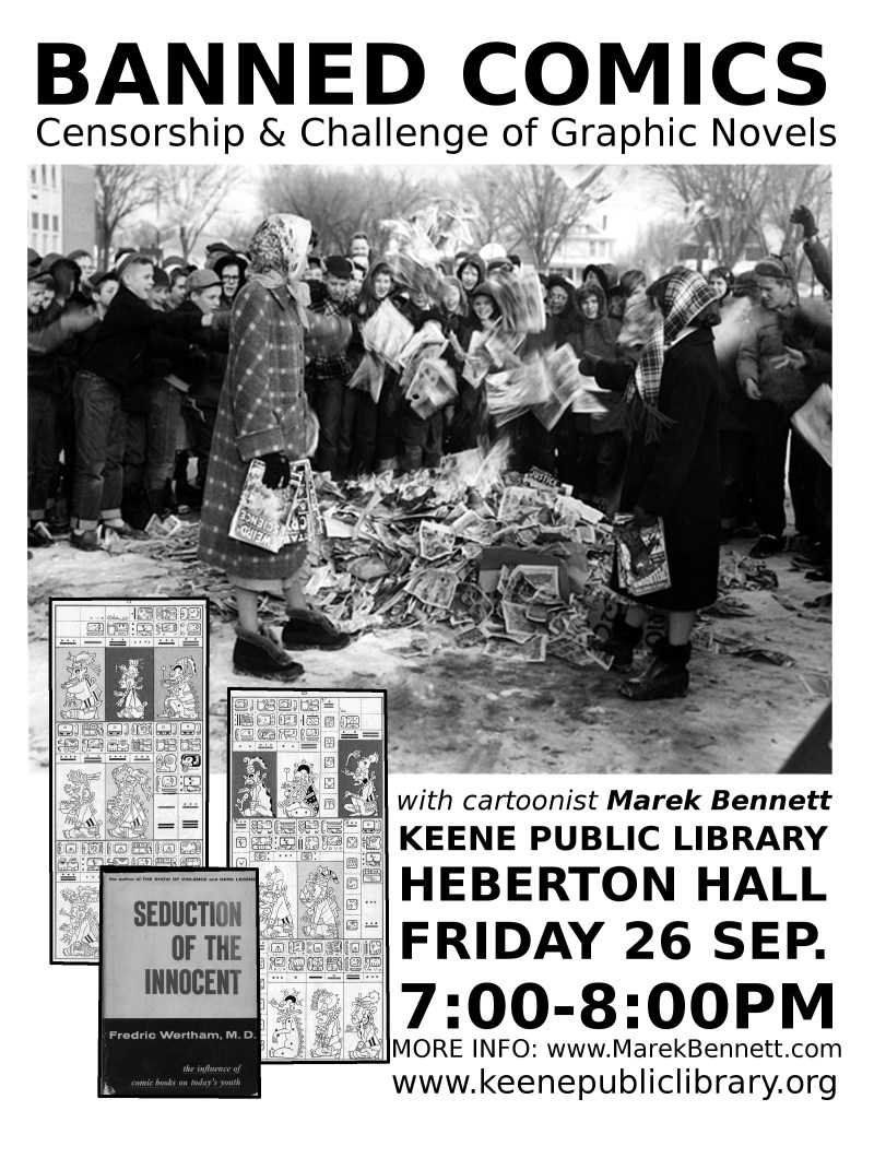26 November (Wednesday) Henniker, NH ~ White Birch Community Center Comics Workshop Join Henniker cartoonist (and White Birch alum) Marek Bennett ( www.MarekBennett.com ) for a lively exploration of the infinite worlds of graphic storytelling and mini-comics publishing! We’ll practice generating ideas, building characters and worlds, and telling stories in pictures, then learn how to publish our original comics as mini-comics, books, and more. No experience necessary — everybody can draw comics! .