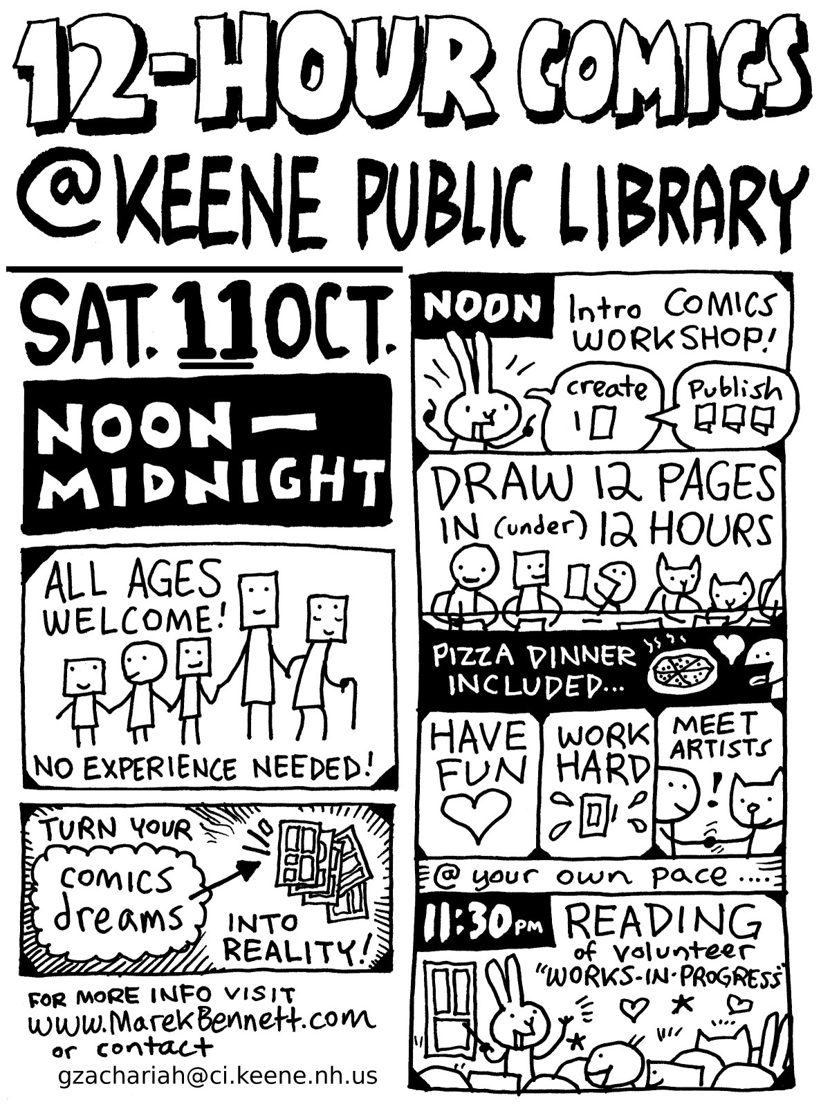 11 October (Saturday) (12 noon – 11:59:59 PM) Keene, NH ~ Keene Public Library “12-Hour Comics” or, “Half-24 Hour Comics” ~ Come draw a half-marathon 12 hours at KPL! ~ EVENT INFO >> POSTER = full size / w=1200 / w=800 .