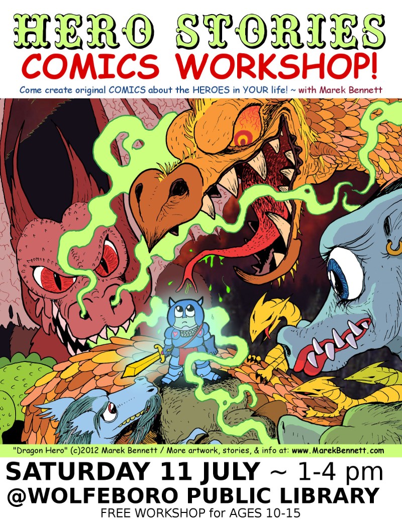 11 July (Saturday) 1-4pm (ages 10-15) Wolfeboro, NH ~ Wolfeboro Public Library Hero Stories Comics Workshop! POSTER:LARGE >> | SMALL >> .