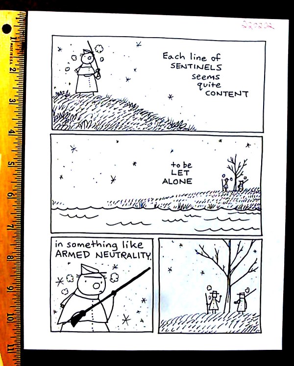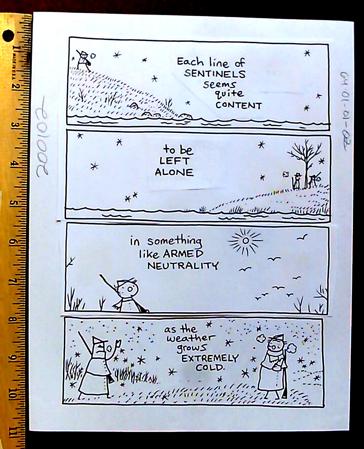 - All pages = drawn & edited by hand (black ink on white paper + glued/taped patches &c.)