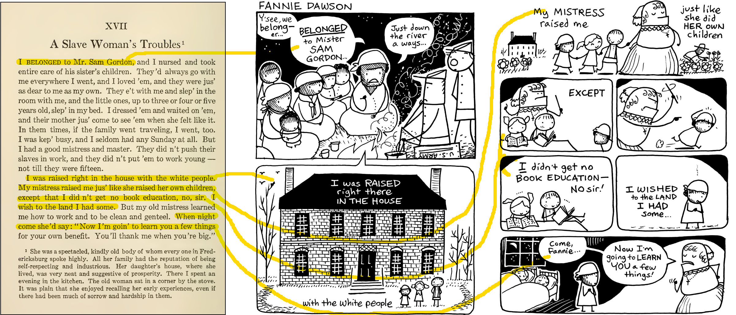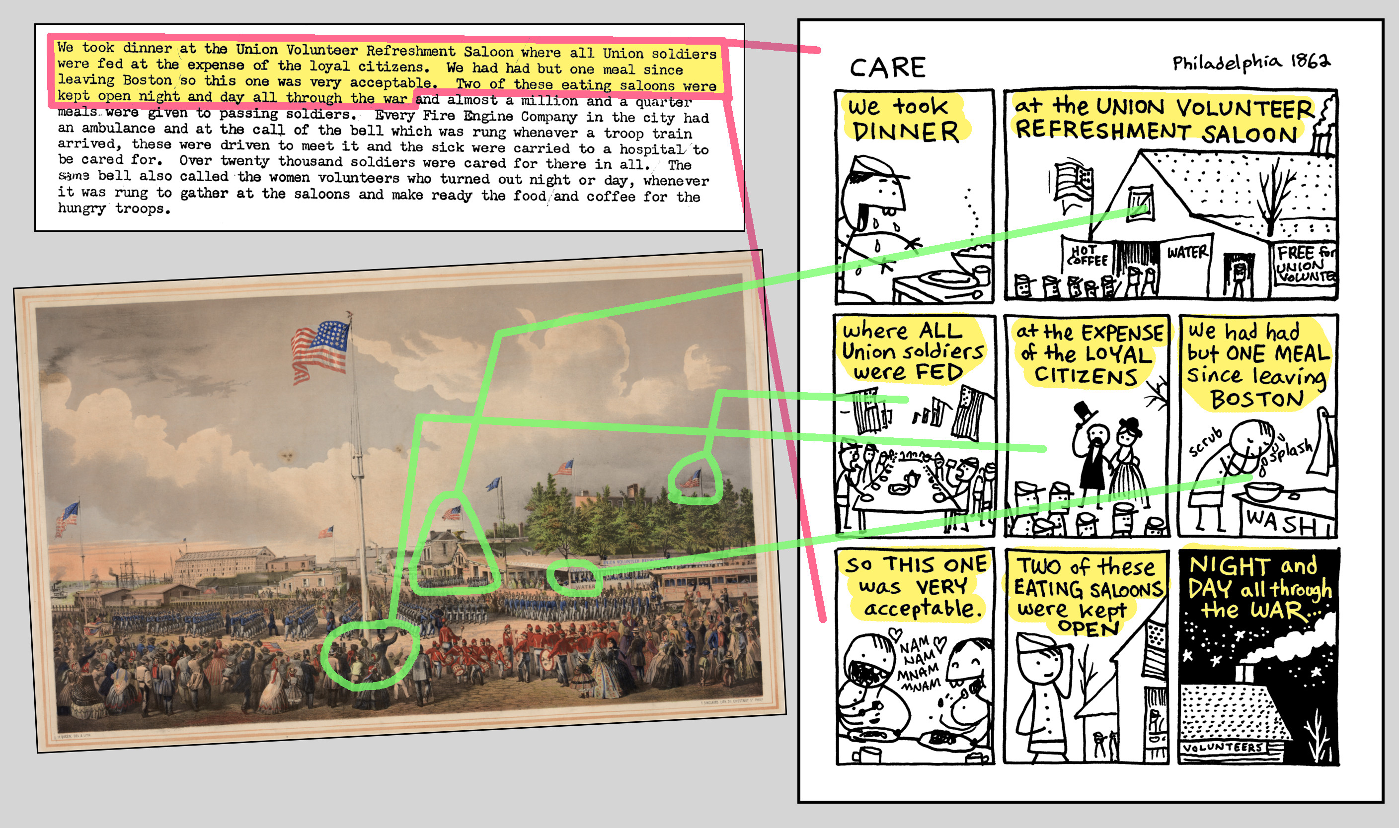 Note how those comics panels help us explore the lithograph’s details one at a time, in a deliberate sequence — and as context for Colby’s narrative!
