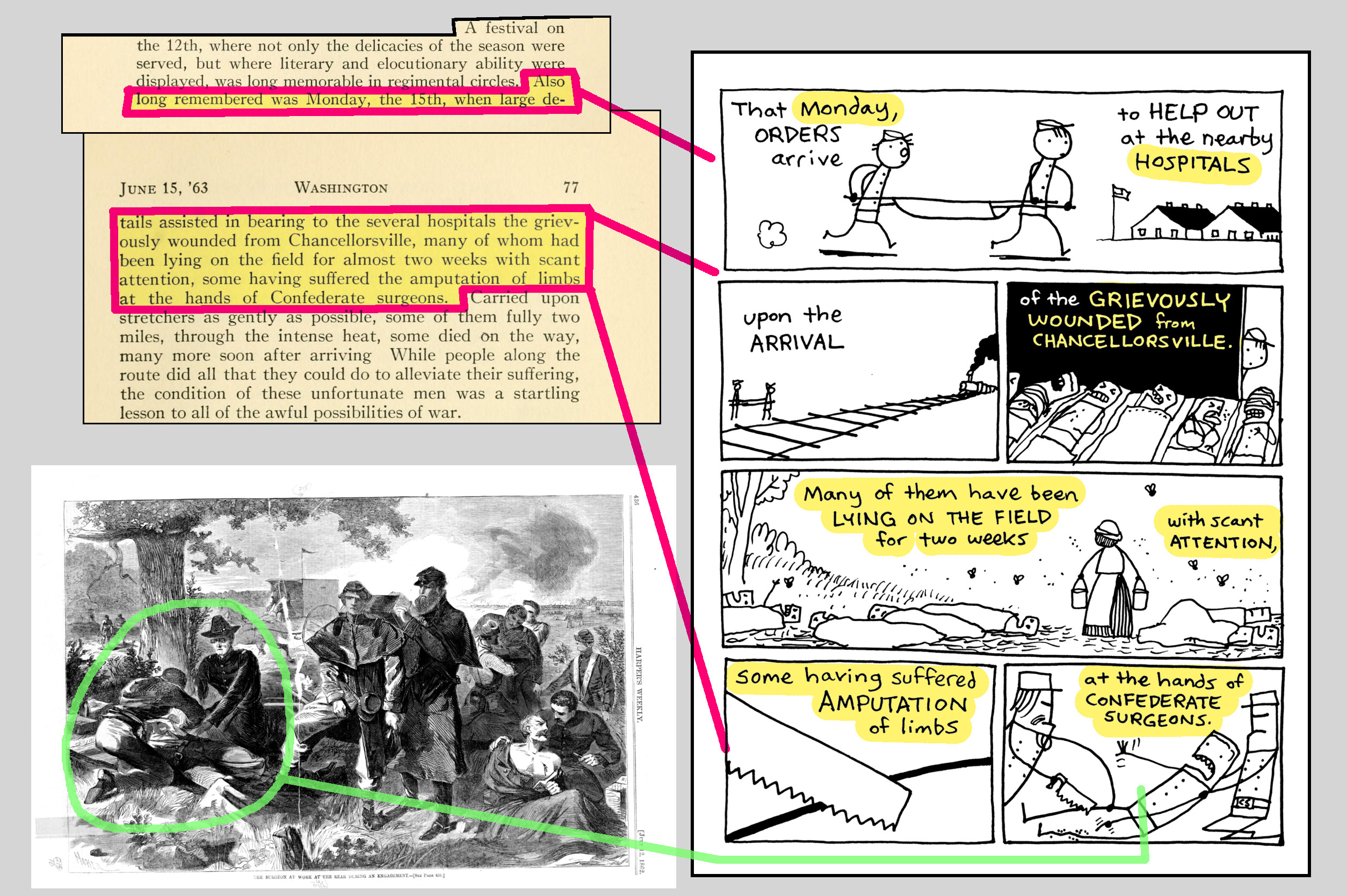 Was Colby actually engaged in carrying the wounded from Chancellorsville? We may never know for sure. But he WAS in Washington at the time, when “large details” from the regiment performed this duty. Even if Colby didn’t personally participate, this task represents a typical experience for someone in his position — So I drew it into the graphic novel to flesh out his narrative.