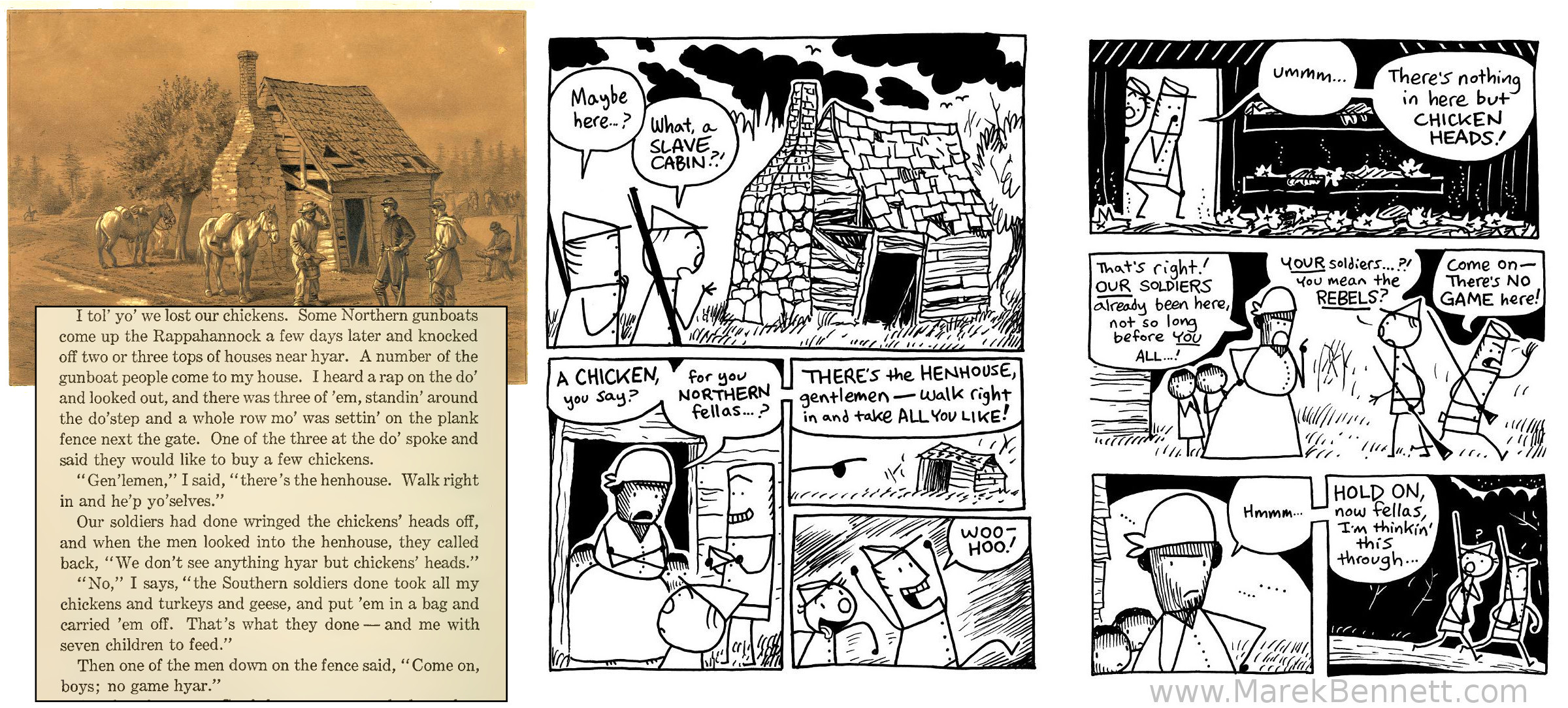 In the page below, I’m drawing a long march from Colby’s perspective. But notice all the blank space around the characters — That represents details that Colby did NOT include in his letter home. Those could be details of setting, actions, or even other characters. What (or who) is in those blank spaces — those “gaps” — in Colby’s narrative?: