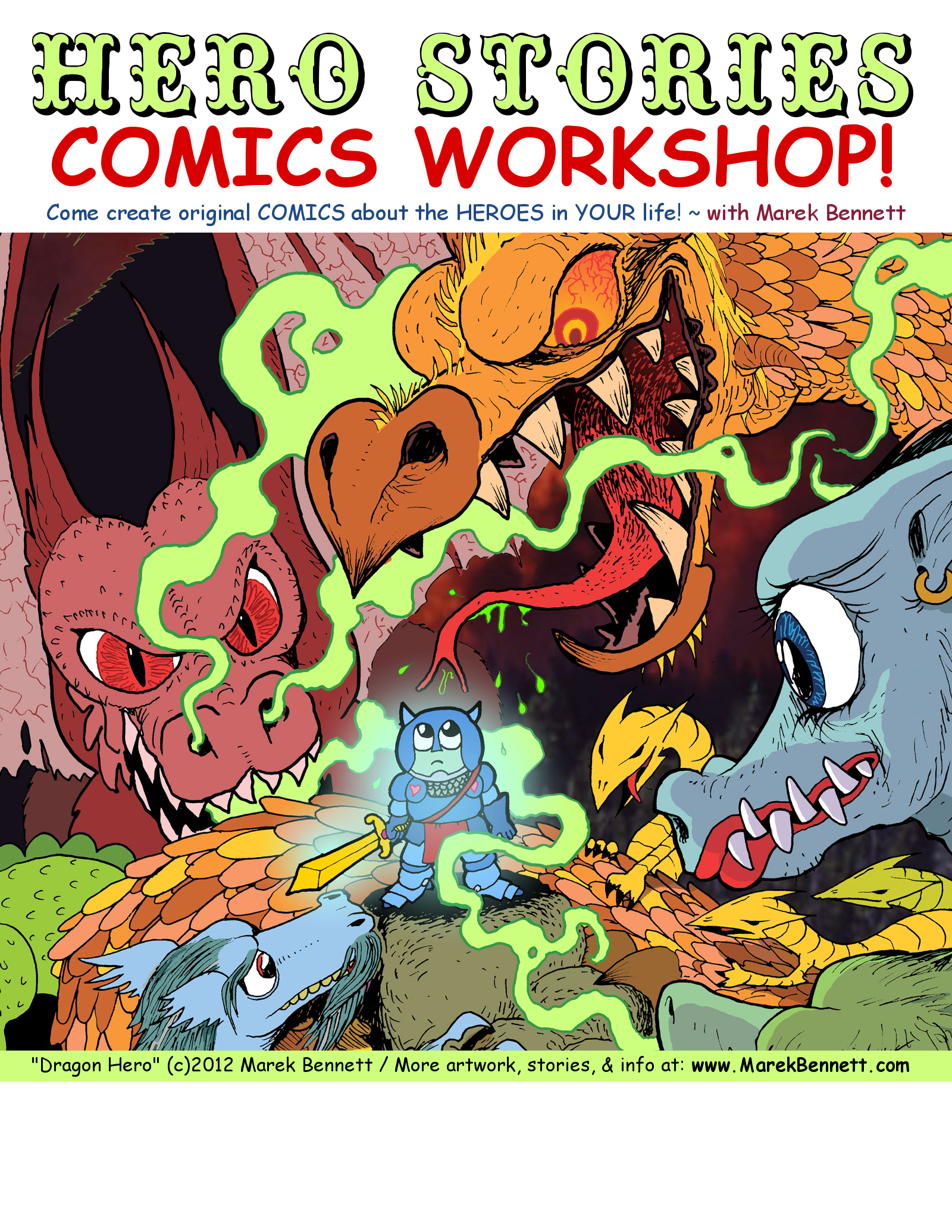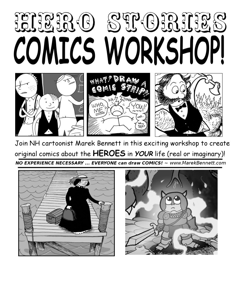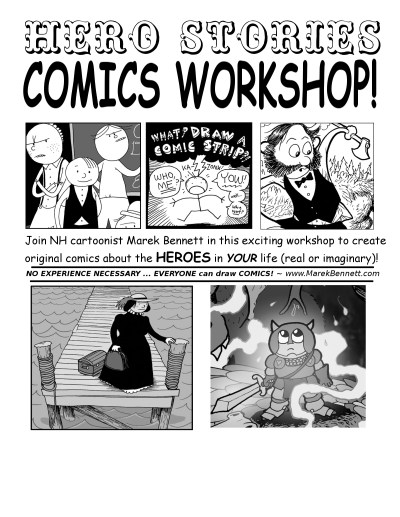 Join NH teaching cartoonist Marek Bennett’s COMICS WORKSHOP as we explore the comics creation process, from designing dynamic characters & rich environments to telling exciting stories in eye-catching panels and readable pages. Marek shares his work with hero characters in his fictional, autobiographical, and historical comics, and helps YOU create an original comic based on a hero in YOUR life. What makes a hero? How do we draw them? How do we capture action and meaning in our artwork, and how do we hold the reader’s attention in the interplay of our visual and verbal storytelling? This interactive workshop builds literacy skills, shares complex project organization and self-publishing techniques, and helps young artists engage productively with their communities. We’ll finish the workshop with a dramatic reading of our hero comics, and go home with all the skills necessary to continue creating comics all Summer long.  No experience required – everyone can draw comics!