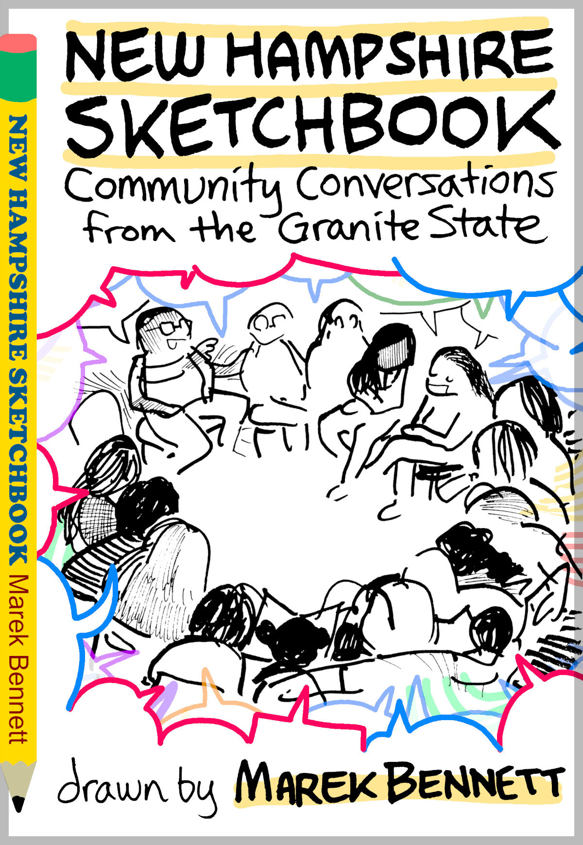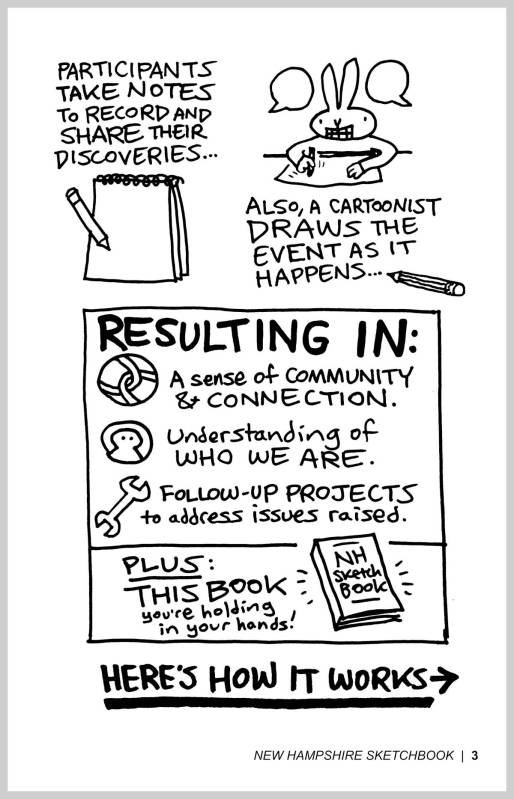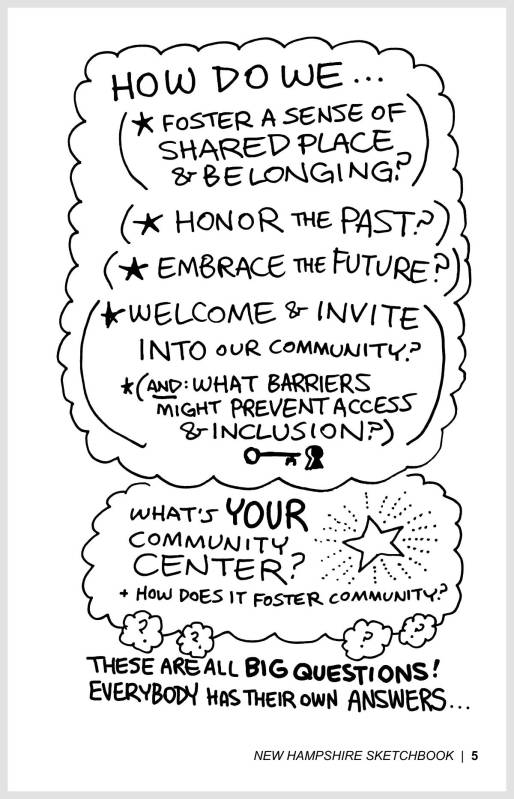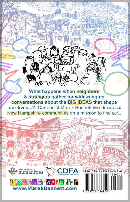 This graphic novel gives a sketchbook-tour of NH’s cities & towns, as residents discuss identity, values, & the issues most important to them — Featuring Marek’s artwork from the 2025 event series, plus comics & reflections to help you start your own “community conversation” with your neighbors!