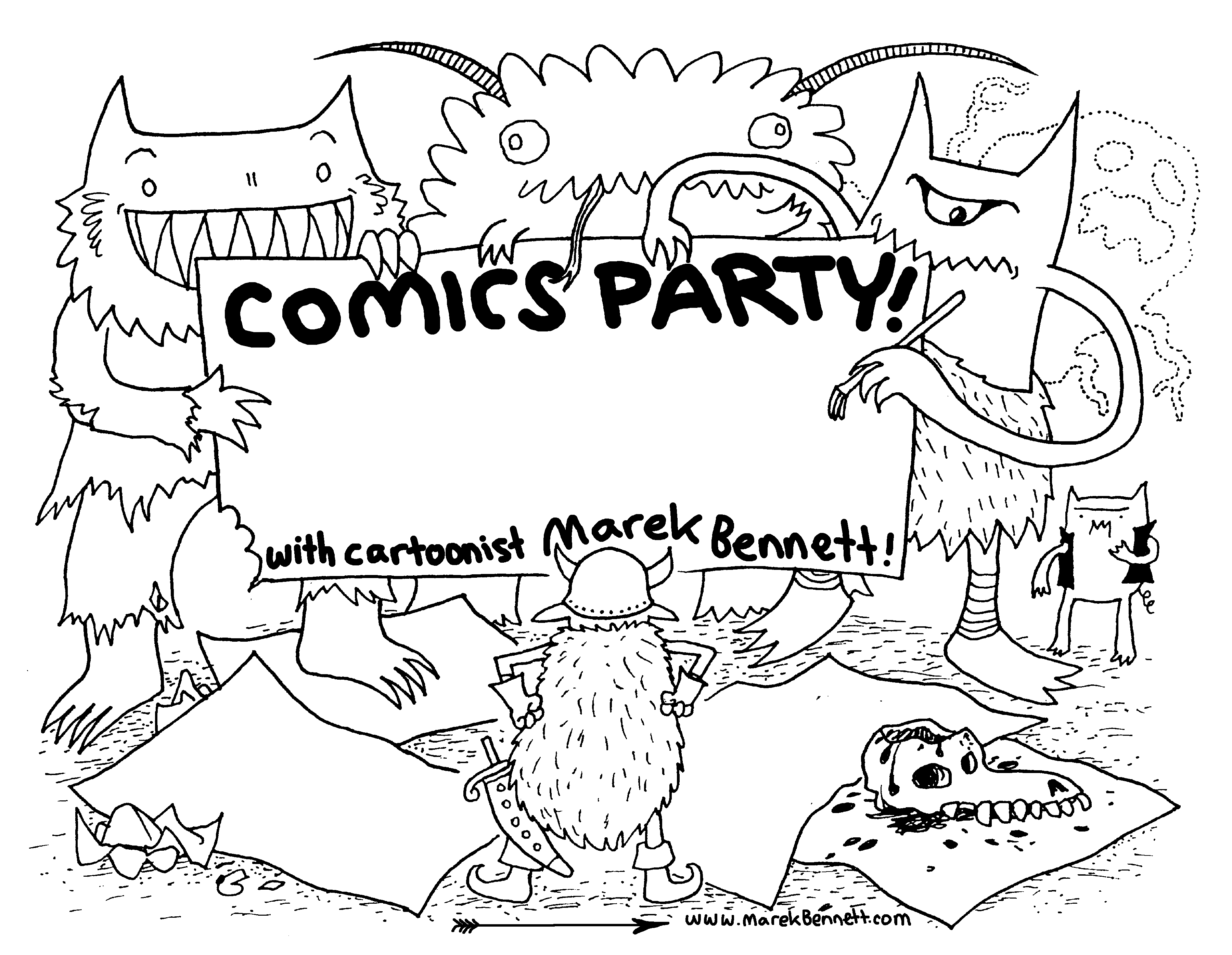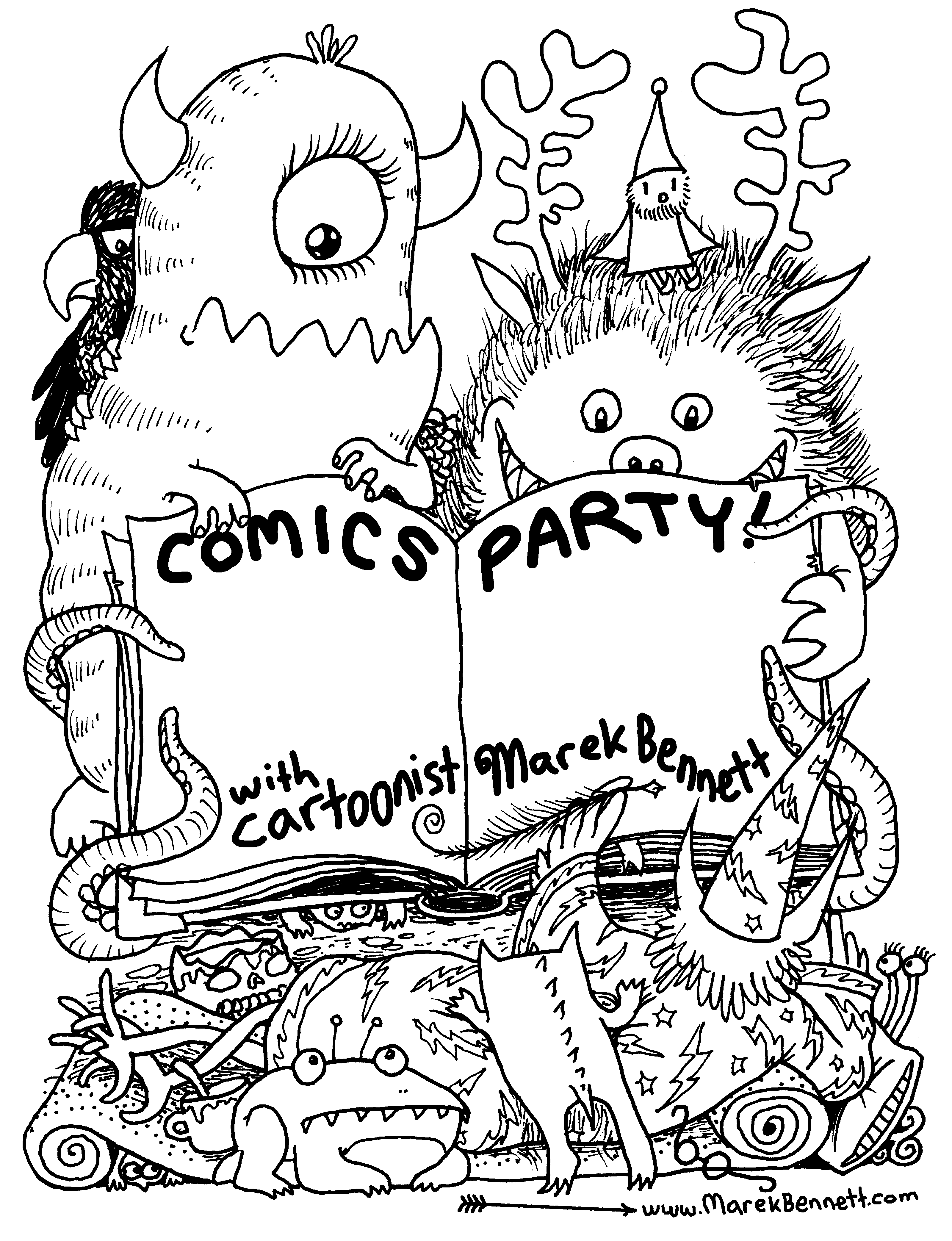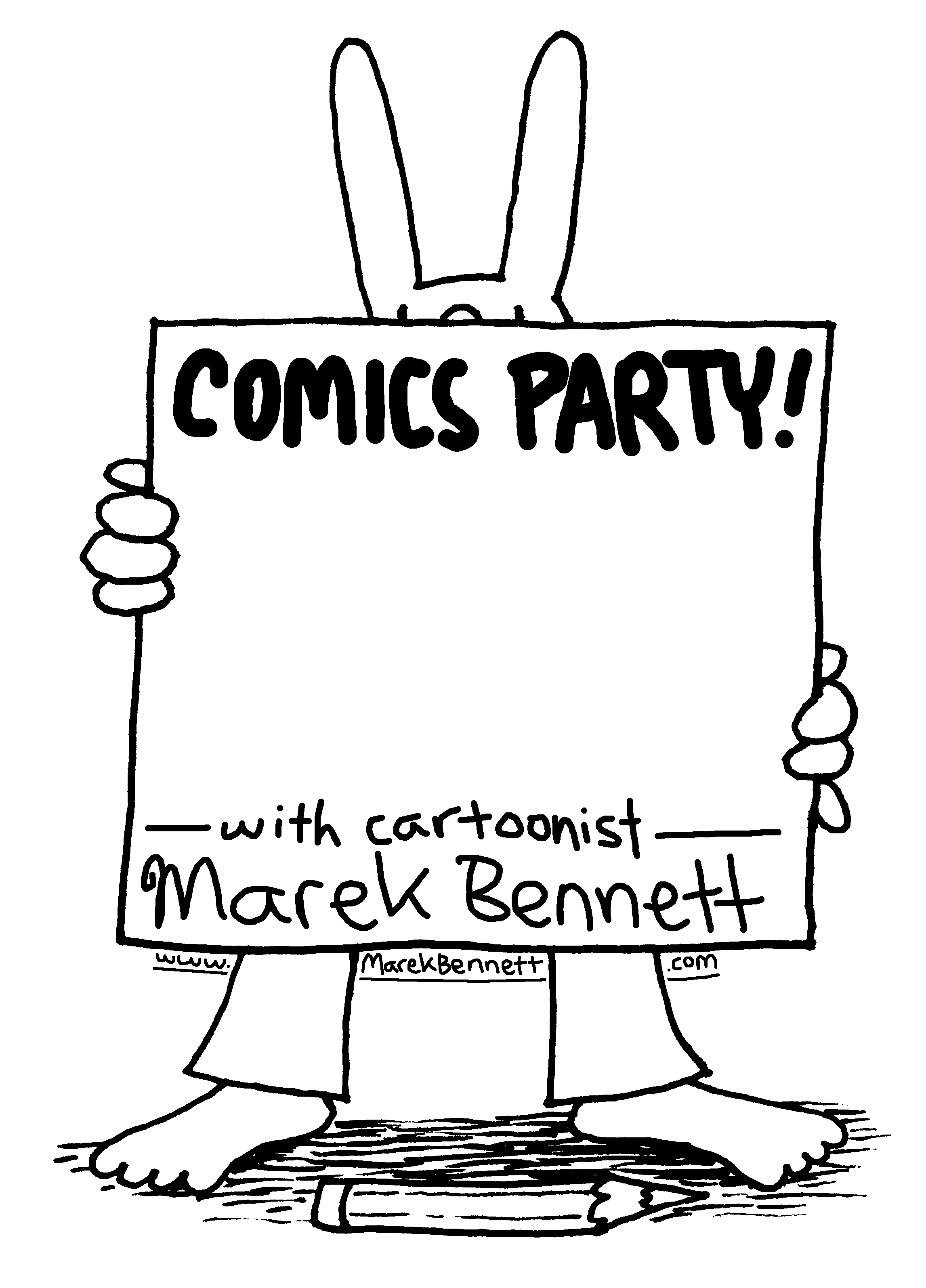 As a special activity, cartoonist Marek Bennett will join us to create some original artwork together. [[ ALT: comics. / cartoon characters. / mini-comics. ]] (Whether you are an accomplished artist or have never made comics before this, you’ll be surprised by what happens when we all draw together. EVERYBODY can draw comics!)We’ll gather on [[PLATFORM]] at [[MEETING TIME + TIME ZONE]].