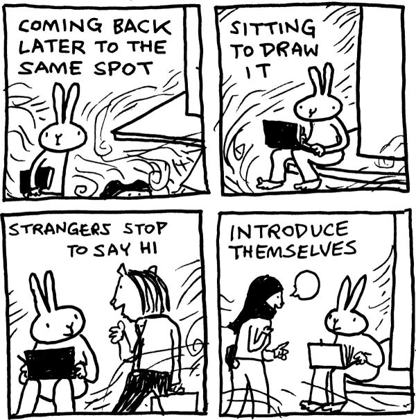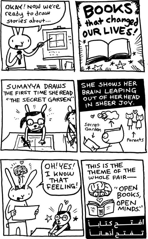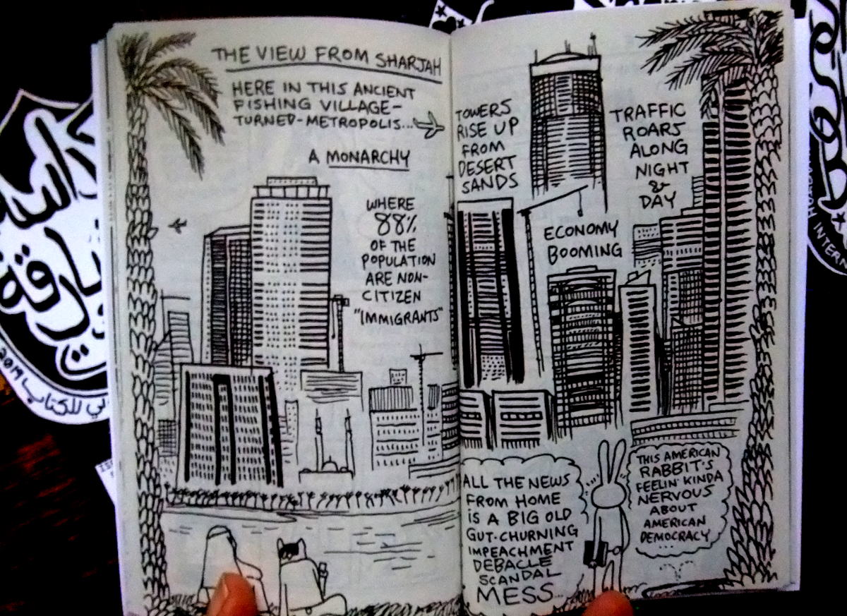 A big thank you to everyone who helped publish Rabbit’s sketchbook graphic novel about art, immigration, religion, & cartoon animals @ the biggest book fair in the Arab world…