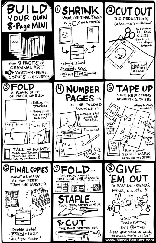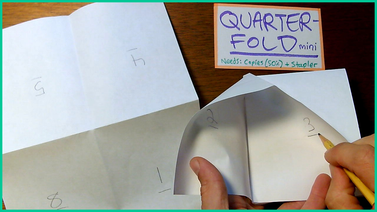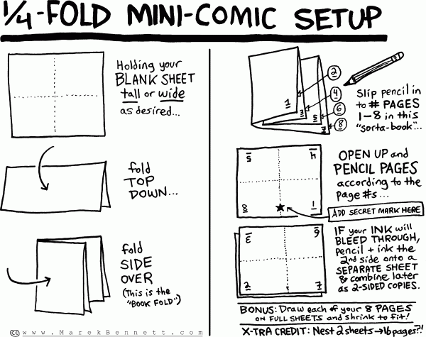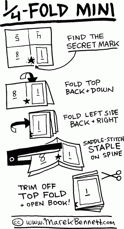 The “Quarter-Fold” format creates an 8-page book out of a single sheet of paper by folding (& eventually cutting & stapling).