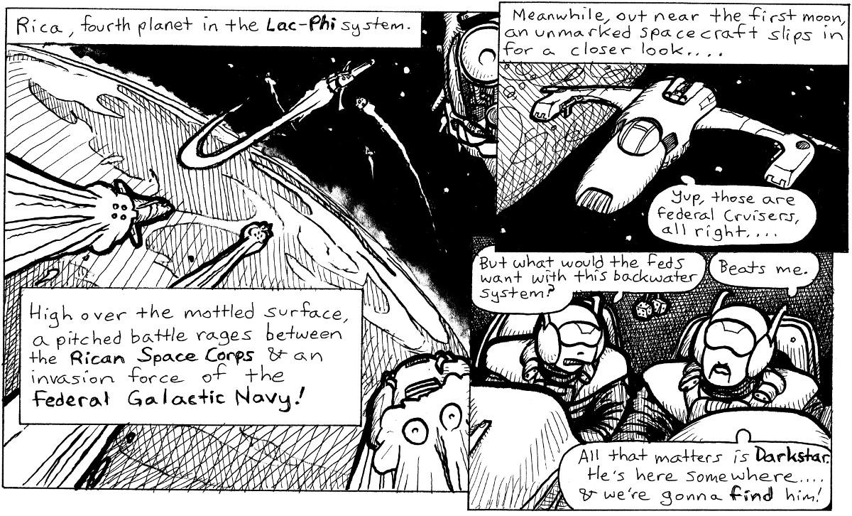 “QUASAR BLASTERS” is the daily comic strip I drew for the Brown Daily Herald (Providence, RI / 1994-1997).