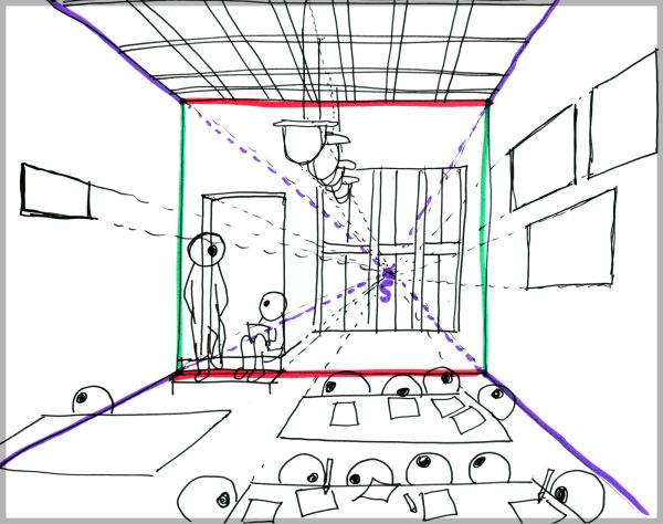 I start my demo by looking at the FAR WALL of a rectangular room, & drawing its rough outline on my blank page: