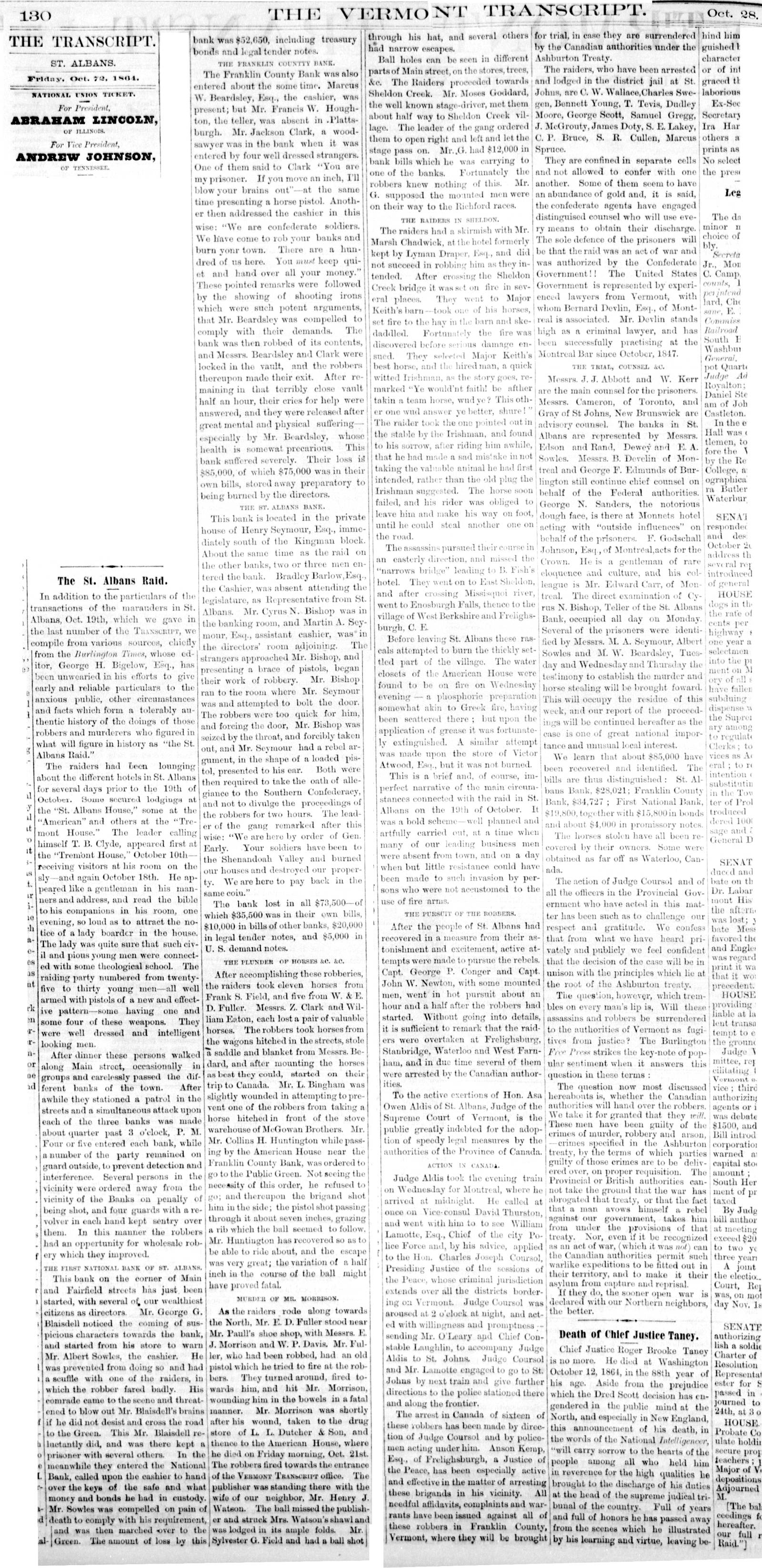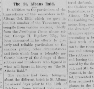 - “The St. Albans Raid” (The VERMONT TRANSCRIPT., October 28, 1864, p.130)