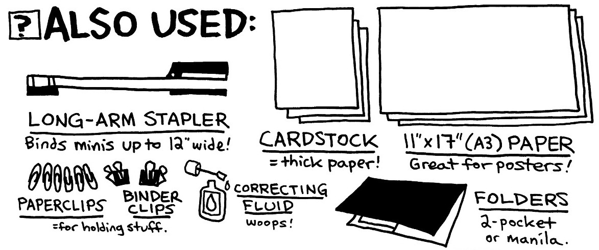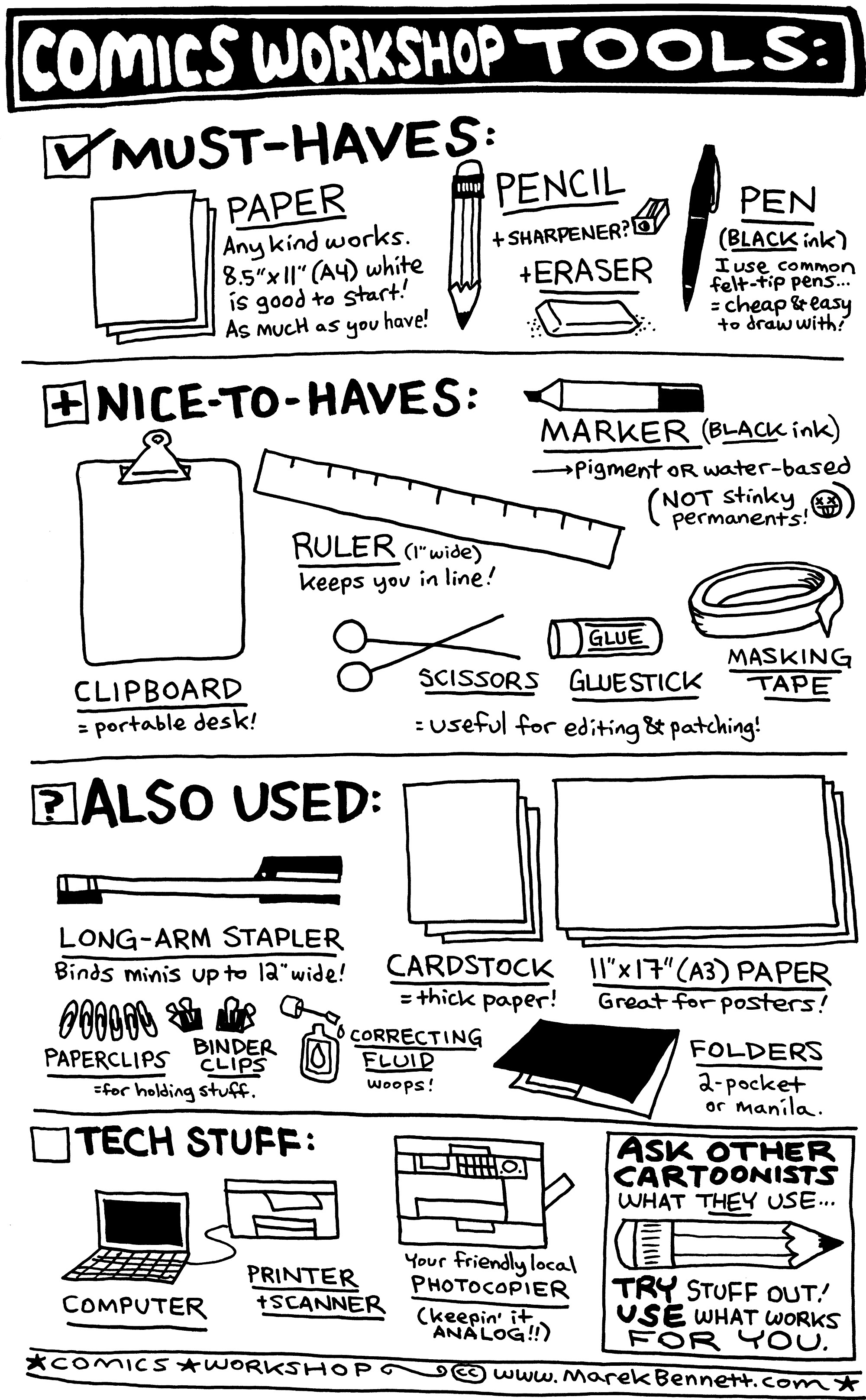 REMOTE STUDENTS: I’ll assume you have the basic MUST HAVEs listed below. You’re welcome to use whatever tools are handy, however. I recommend experimenting & seeing which tools work best for your art style & creative approach.